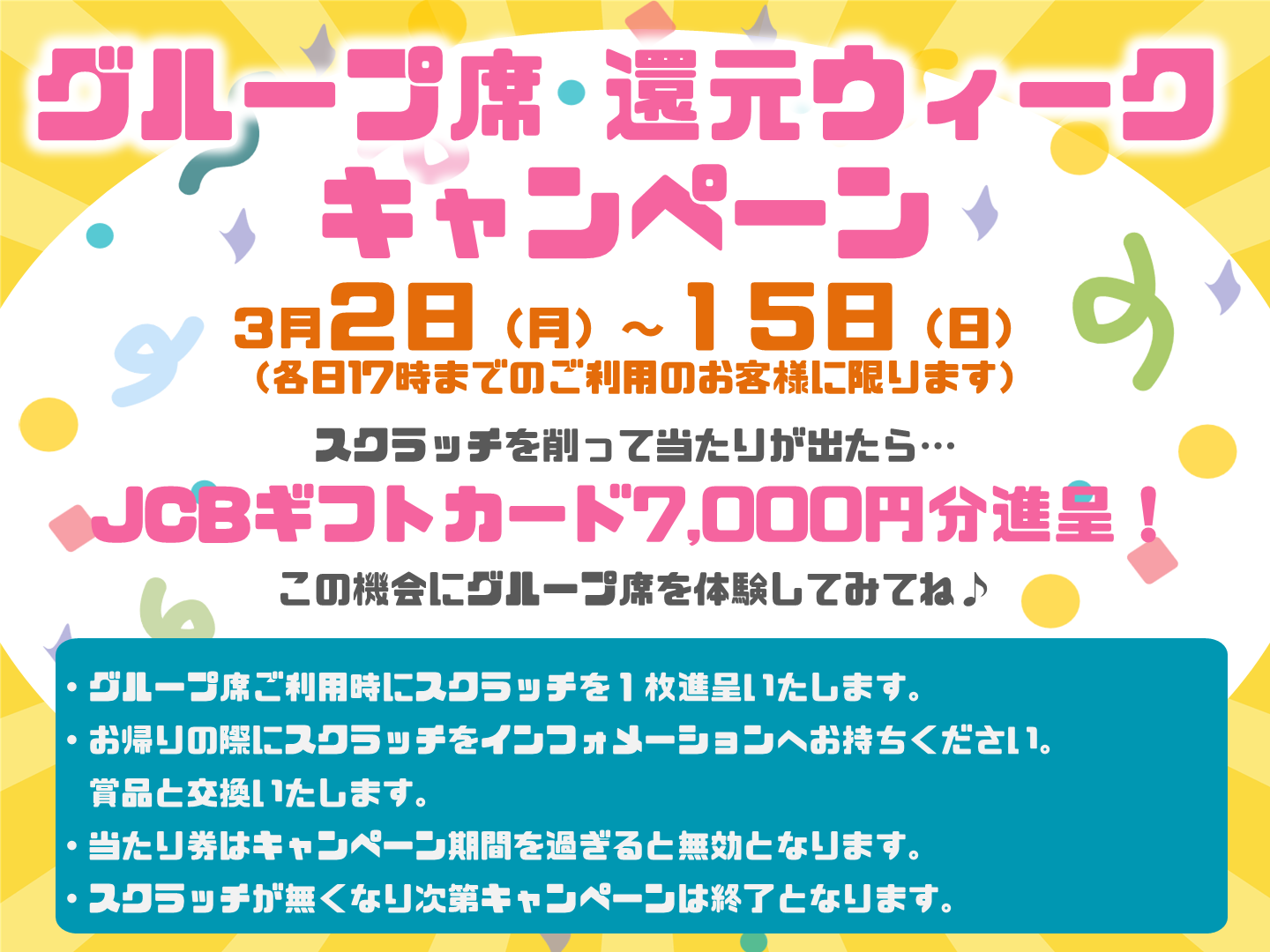 3月2日(月)~15(日)グループ席ご利用のお客様にJCBギフトカードが当たる